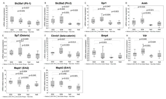 We found a significant downregulation of genes related to Pi transport (Slc20a1, Slc20a2, Xpr1, Ankh; Figure 2A–D) and cellular signaling (Sp7, Ctnnb1, Bmp4, Vdr, Mapk1/3, Figure 2E–G; Fgfr2; Table S2) in Nx2 and Nx6 groups vs. SO2 and SO6, but not in SO6 vs. SO2 (Figure S1). Bone expressions of Dkk1, Sost, Kl, Fgf23, Lgr4, Tnfrsf11b, Tnfsf11, Cyp27b1, Sfrp2, Fzd2, and Wnt10b (Table S2) had no significant differences between groups (Figure S1). The predicted interaction networks and their likely involvement in the biological processes of the differentially expressed genes’ products are shown in Figure S4.
