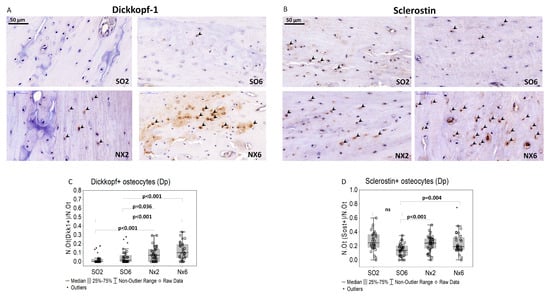 Representative microphotographs for bone Dickkopf-1 (A) and sclerostin (B) IHC staining in the distal diaphyseal region (black arrowheads—IHC-positive osteocytes); the ratio of dickkopf-1-positive ((C), N.Ot(Dkk1+)/N.Ot, n = 40 for each group) and sclerostin-positive osteocytes ((D), N.Ot(Sost+)/N.Ot, n = 40 for each group); ns—not significant.
