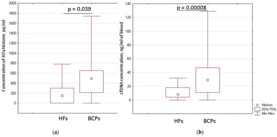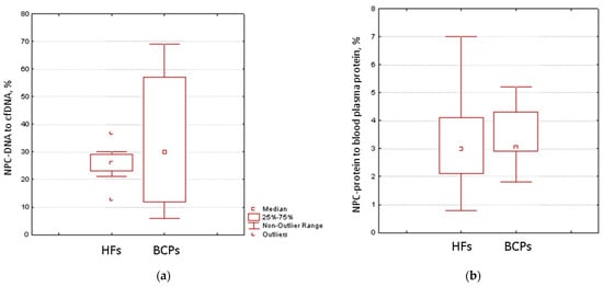 It was shown that the share of DNA in the NPCs from cfDNA in blood plasma in HFs and BCPs did not differ significantly (the median was 26% and 30%, respectively, p = 0.655, Mann–Whitney U-test) (Figure 3a), as well as the share of protein in histone-containing NPCs from blood plasma total protein (the median was 3.00% and 3.05%, respectively, p = 0.521, Mann–Whitney U-test) (Figure 3b).