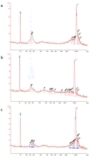 Electrophoregrams of pooled DNA sample from HF blood plasma NPCs (a) and individual DNA samples from BCP blood plasma NPCs (b,c). Data of Agilent 2100 BioanalyserTM assay. Positions of 35 and 10,380 bp markers are shown with arrows.