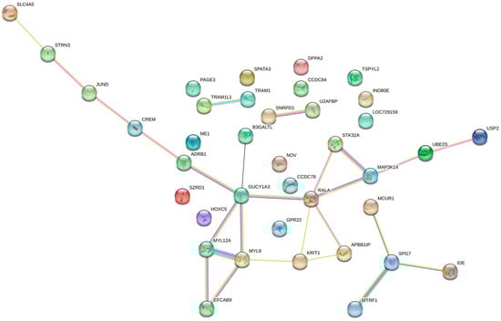 Then, using STRING web tool PPI network for 38 NCP universal proteins was constructed (Figure 4). It was found that GUCY1A3, MYL12A, MYL9, KRIT1, APBB1P, RALA, MAP3K14, and SPG7 displayed the majority of protein–protein interactions (PPI).