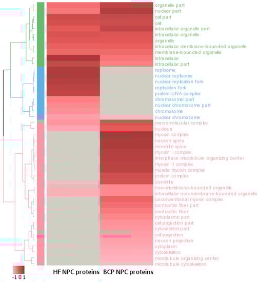 Heat map and dendrogram of the results of GO functional enrichment analysis of NPC proteins from BCPs and HFs by cellular components obtained via STRING via STRING (https://string-db.org/, accessed on 1 March 2023) and visualized using R (https://www.r-project.org/, accessed on 1 March 2023). GO results with p < 0.05 are shown as normalized −log (p) values.