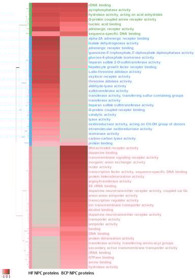 Heat map and dendrogram of the results of GO functional enrichment analysis of NPC proteins from BCPs and HFs by molecular functions obtained via STRING (https://string-db.org/, accessed on 1 March 2023) and visualized using R (https://www.r-project.org/, accessed on 1 March 2023). GO results with p < 0.05 are shown as normalized −log (p) values.