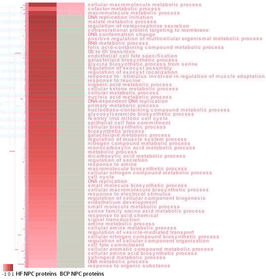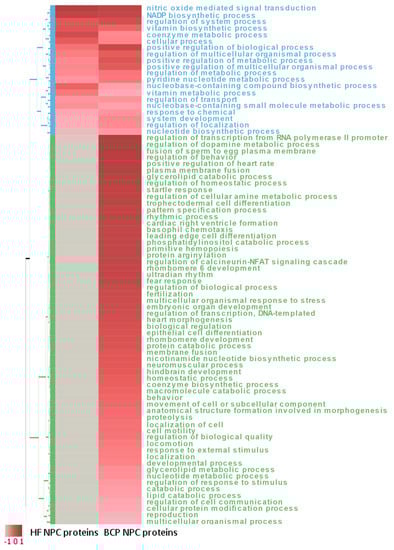 Heat map and dendrogram of the results of GO functional enrichment analysis of NPC proteins from BCPs and HFs by biological processes obtained via STRING (https://string-db.org/, accessed on 1 March 2023) and visualized using R (https://www.r-project.org/, accessed on 1 March 2023). GO results with p < 0.05 are shown as normalized −log (p) values.