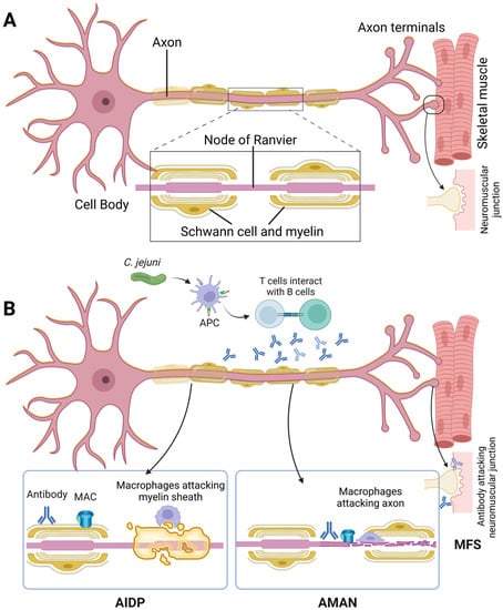 (A) A typical motor nerve is shown here. The nerve axon is covered by Schwann cells, which form the myelin sheath. This myelin sheath is discontinuous and contains gaps called as the node of Ranvier. The action potential travels from node to node. (B) In AIDP, the myelin sheath is affected; in AMAN and AMSAN, the axon is affected, while in MFS, the neuromuscular junction area is affected. Abbreviations: APC: antigen-presenting cell; MFS: Miller–Fisher syndrome.
