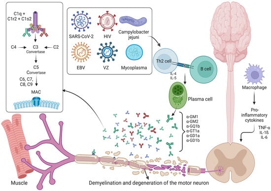 The pathophysiology of GBS is the result of autoimmune processes, whereby both cell-mediated and humoral responses come into play. The immunobiology involves T- and B-cell responses, complement system (discussed separately), antiganglioside antibodies and molecular mimicry [31]. Molecular mimicry deals with antecedent infection with micro-organisms wherein identical epitopes are shared incidentally between microbial structures and nerve structures, leading to a cellular immune response. Microbes that have been significantly associated with GBS are Campylobacter jejuni, Mycoplasma pneumonia, Haemophilus influenza, Epstein–Barr virus, cytomegalovirus (CMV), varicella zoster virus and influenza virus [15,32,33,34], out of which the most frequently associated organism is C. jejuni [35].