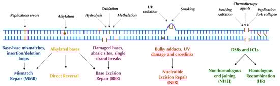 - Marteijn, J.A.; Lans, H.; Vermeulen, W.; Hoeijmakers, J.H.J. Understanding nucleotide excision repair and its roles in cancer and ageing. Nat. Rev. Mol. Cell Biol. 2014, 15, 465–481. [Google Scholar] [CrossRef]