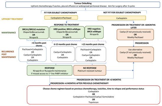 Treatment algorithm for advanced epithelial ovarian cancer.