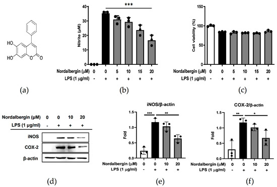 Effect of nordalbergin on the NO production, iNOS and COX-2 expression, and cell viability by LPS-stimulated BV2 cells. (a) The chemical structure of nordalbergin (M.W. 254.24). BV2 cells were pretreated with nordalbergin (0–20 μM) for 30 min and then primed with LPS for 24 h. (b) Production of NO was analyzed using Griess reagent assay. (c) Cell viability was detected using MTT assay. (d) iNOS and COX-2 expressions were measured by Western blot, while β-actin expression was used as a loading control. Quantitative results are shown in (e,f). Data are shown as mean ± standard deviation (SD) of three independent replicates (* p < 0.05, ** p < 0.01, *** p < 0.01).