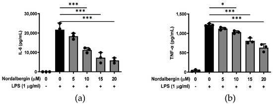 Effect of nordalbergin on the production of IL-6 and TNF-α by LPS-stimulated BV2 cells. Cells were pretreated with nordalbergin (0–20 μM) for 30 min and then primed with LPS for 24 h. Production of (a) IL-6 and (b) TNF-α was detected using ELISA. Data are shown as mean ± SD (n = 3; * p < 0.05, *** p < 0.01).