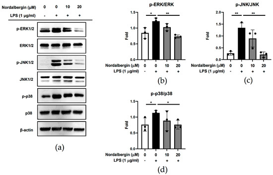 MAPKs (ERK, JNK and p38 MAPK) play crucial roles in the modulation of inflammatory responses through regulating the production of pro-inflammatory mediators and cytokines by phosphorylating various proteins including transcription factors [19]. To examine the effects of nordalbergin on the MAPKs signaling pathway activation, BV2 cells were pretreated with nordalbergin for 30 min and primed with LPS for 2 h. MAPKs-related protein expressions were detected by Western blot. The experimental results showed that nordalbergin significantly reduced the phosphorylation of ERK, JNK and p38 MAPK by LPS-stimulated BV2 cells, indicating that nordalbergin significantly attenuated the activation of ERK, JNK and p38 MAPK signaling pathways under LPS stimulation (Figure 3a–d).