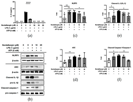 Effect of nordalbergin on the secretion of IL-1β and the activation of NLRP3 inflammasome by LPS-stimulated BV2 cells. Cells were pretreated with different concentrations of nordalbergin for 30 min and primed with LPS for 5 h following treatment of 5 mM ATP. (a) The secretion of IL-1β was analyzed by ELISA. (b) Expressions of NLRP3, ASC, cleaved-IL-1β, pro-IL-1β, cleaved-caspase-1 and pro-caspase-1 were examined by Western blot, with that of β-actin used as a loading control. The quantified results are shown in (c–f). N.D. means not detected. Data are presented as mean ± SD (n = 3–6; * p < 0.05, ** p < 0.01, **** p < 0.0001).