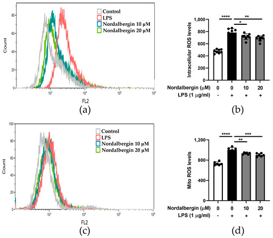 A total of 5 × 105 BV2 cells were seeded in 12-well plates and allowed to adhere overnight. Afterward, cells were pretreated with nordalbergin (0–20 μM) for 30 min following treatment of 1 μg/mL LPS for 24 h. For the detection of intracellular ROS, cells were stained with 1 μM H2DCFDA for 30 min using the H2DCFDA kit (Invitrogen, Carlsbad, CA, USA), and then detected at 492–527 nm by flow cytometry (Beckman Coulter, Elkin, NC, USA). For mitochondrial ROS detection, cells were stained with the MitoSOX kit and then detected at 510–580 nm by flow cytometry (Beckman Coulter, Elkin, NC, USA).