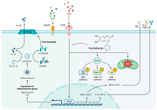 In summary, the present study is the first to demonstrate that nordalbergin suppresses the secretion of inflammatory mediators and cytokines and decreases the production of both intracellular and mitochondrial ROS through attenuating MAPK signaling pathways and NLRP3 inflammasome activation in LPS-stimulated microglial cells (Figure 6). These results suggest that nordalbergin exhibits anti-inflammatory and anti-oxidative effects, indicating its potential for managing neuroinflammation.