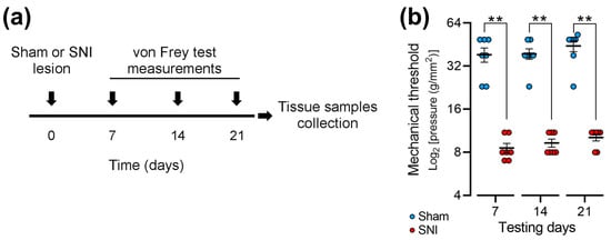 Experimental timeline and mechanical sensitivity threshold. (a) Experimental protocol timeline. Briefly, each rat was subjected to a unilateral sham or spared nerve injury (SNI) lesion. Brain tissue samples were collected 21 days after lesion. (b) Level of mechanical sensitivity measured by withdrawal response to von Frey filament stimulation across different time points. As expected, a large decrease was observed in the threshold required to induce a paw response in the SNI-treated rats (n = 7) when compared with control (sham)-treated rats (n = 7). Comparisons between experimental groups and treatments are based on the non-parametric Kruskal–Wallis test followed by Dunn’s post hoc test. Values are presented as mean ± S.E.M. **, p < 0.01.
