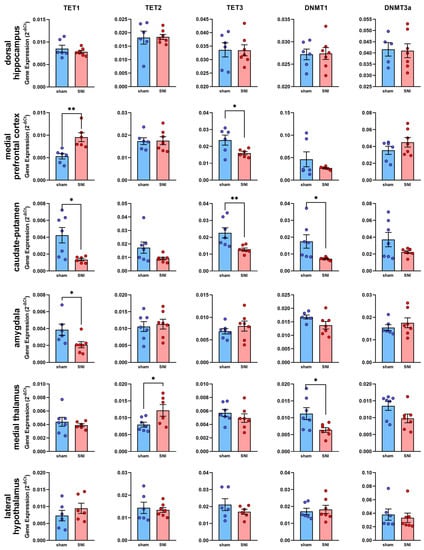 From all the studied areas, TET3 was only evidenced to be increased in the medial prefrontal cortex (sham: 0.02374 ± 0.003011; SNI = 0.01604 ± 0.0009623; t(10) = 2439, p = 0.0349) and the caudate-putamen (sham: 0.02262 ± 0.003046; SNI = 0.01280 ± 0.0008655; t(12) = 3101, p = 0.0092) (Figure 2).
