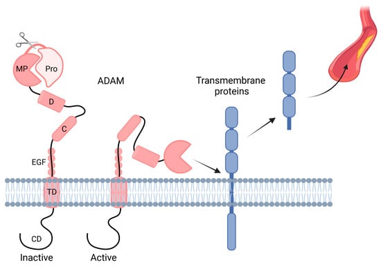 ADAM domain structure. A disintegrin and metalloproteinases (ADAM) present on the transmembrane consists of seven domains, namely the prodomain (pro), metalloprotease domain (MP), disintegrin domain (D), cysteine-rich domain (C), EGF-like domain (EGF; except for ADAM10 and ADAM17), transmembrane domain (TD), and cytoplasmic domain (CD). ADAMs are activated after the prodomain (Pro) is cleaved off, after which they can shed, among others, transmembrane proteins, which are released into the circulation. Created with BioRender.com.