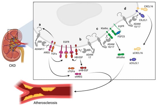 Overview of shedding activities of a disintegrin and metalloproteinases (ADAM) 10 and ADAM17 in the kidney. The shedding of ADAM10 and ADAM17 substrates in chronic kidney disease (CKD). (a) Activation of the epidermal growth factor receptor (EGFR) pathway by shedding amphiregulin (AREG) and transforming growth factor α (TGFα) by ADAM17. AREG and TGFα shedding results in the upregulation of ADAM17 on the transmembrane. (b) Additionally, heparin-binding EGF-like growth factor (HB-EGF) is cleaved by ADAM10, also activating the EGFR pathway. (c) Shedding of Klotho is mediated by ADAM10 as well as ADAM17, resulting in soluble Klotho (sKlotho), which exerts renoprotective effects. Membrane-bound Klotho, fibroblast growth factor receptor (FGFR), and fibroblast growth factors 23 (FGF23) are from a trimeric signaling complex regulating kidney homeostasis. (d) ADAM10 and ADAM17 can shed chemokine (C-X3-C motif) ligand 1 (CX3CL1) and chemokine (C-X-C motif) ligand 16 (CXCL16), producing soluble chemokines. sAREG, sTGFα, sHB-EGF, sKlotho, sCX3CL1, and sCXCL16 are all released into the circulation and can translocate to the arterial endothelium and affect atherosclerotic processes. Created with BioRender.com.