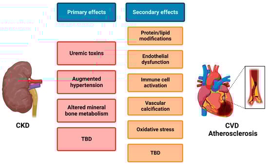 Simplified overview of mechanisms involved in cardiorenal cross-talk. Upon kidney damage and development of chronic kidney disease (CKD), several primary effects occur that can either directly or via subsequent secondary effects influence atherosclerosis and thus cardiovascular disease (CVD). Although several mechanisms are already known, many more remain to be defined (TBD). Created with BioRender.com.