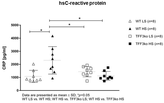 Serum concentrations of the inflammatory marker hsCRP in Tff3-deficient mice and their respective wild-type controls exposed to a 7-day high-salt diet. hsCRP—high-sensitivity C reactive protein; WT LS—wild-type (C57BL/6N) mice on a low-salt diet; WT LS—wild-type (C57BL/6N) mice on a high-salt diet; TFF3ko LS—Tff3 knock-out mice on a low-salt diet; TFF3ko HS—Tff3 knock-out mice on a high-salt diet. Data are presented as mean ± SD and were analyzed by one-way ANOVA or Kruskal–Wallis test where appropriate. * p-values less or equal 0.05 are considered significant.