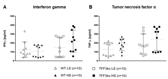 The serum concentrations of inflammatory markers IFN-γ (A) and TNF-α (B) in Tff3-deficient mice and their respective wild-type controls exposed to a 7-day high-salt diet. WT LS—wild-type (C57BL/6N) mice on a low-salt diet; WT LS—wild-type (C57BL/6N) mice on a high-salt diet; TFF3ko LS—Tff3 knock-out mice on a low-salt diet; TFF3ko HS—Tff3 knock-out mice on a high-salt diet; IFN-γ—interferon gamma; TNF-α—tumor necrosis factor alpha. Data are presented as mean ± SD and were analyzed by one-way ANOVA or Kruskal–Wallis test where appropriate.