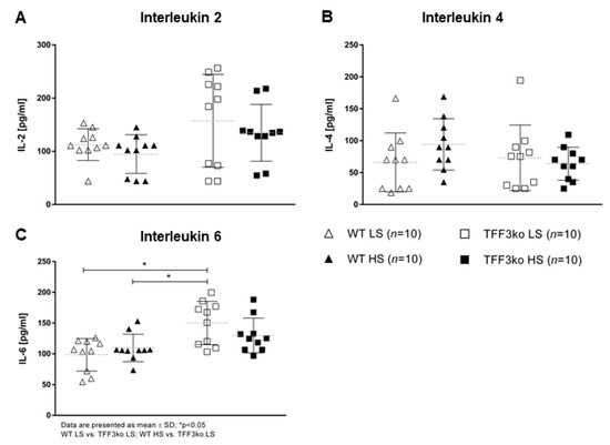 The serum concentrations of inflammatory markers IL-2 (A), IL-4 (B), and IL-6 (C) in Tff3-deficient mice and their respective wild-type controls exposed to a 7-day high-salt diet. IL—interleukin; WT LS—wild-type (C57BL/6N) mice on a low-salt diet; WT LS—wild-type (C57BL/6N) mice on a high-salt diet; TFF3ko LS—Tff3 knock-out mice on a low-salt diet; TFF3ko HS—Tff3 knock-out mice on a high-salt diet. Data are presented as mean ± SD and were analyzed by one-way ANOVA or Kruskal–Wallis test where appropriate. * p-values less or equal 0.05 are considered significant.