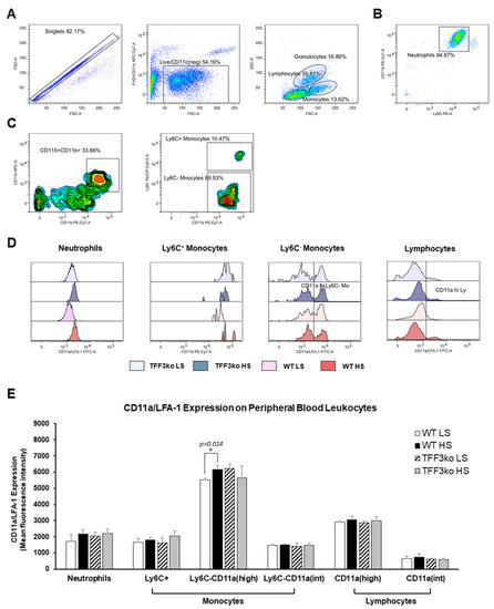 Figure 6 represents the gating strategy for CD11a/LFA-1 expression in the peripheral blood neutrophils, monocytes, and lymphocytes (panels A, B and C). There was no difference between the TFF3ko and WT mice in the expression of CD11a/LFA-1. In most leukocyte subsets, LFA-1 expression was increased after exposure to the HS diet; however, this was statistically significant only for the Ly6− monocytes of the WT HS group, expressing high levels of LFA-1 (p = 0.014; Figure 6D,E).