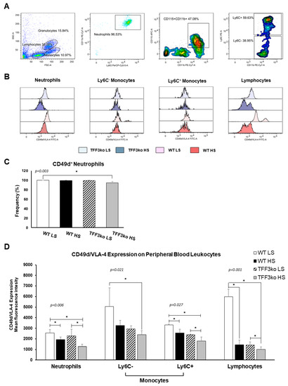 The effect of Tff3 deficiency and a 7-day high-salt (HS) diet on the integrin very late antigen-4 (VLA-4) in the peripheral blood leukocytes (PBLs). (A) demonstrates the representative gating strategy, which included gating on leukocyte subsets based on forward and side scatter. Neutrophils were further defined as Ly6G and CD11b double-positive cells among the granulocyte subpopulation, while monocytes were defined as CD11b+CD115+ mononuclear cells that were additionally stratified based on the Ly6C expression. (C) shows changing rates of CD49d+ neutrophils in the study groups following a HS diet. (B,D) show changing CD49d/VLA-4 expression rates on PBLs in the study groups following a HS diet. HS—high salt; VLA-4—very late antigen-4; PBLs—peripheral blood leukocytes; WT LS—wild-type (C57BL/6N) mice on a low-salt diet; WT LS—wild-type (C57BL/6N) mice on a high-salt diet; TFF3ko LS—Tff3 knock-out mice on a low-salt diet; TFF3ko HS—Tff3 knock-out mice on a high-salt diet. Data are presented as mean ± SD and were analyzed by one-way ANOVA or Kruskal–Wallis test where appropriate. In some cases, the effect of the diet on a particular strain (TFFko or WT) was tested by Student’s t-test or Mann–Whitney U test; * p-values less or equal 0.05 are considered significant.