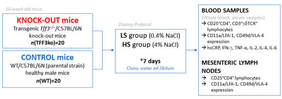 Schematic presentation of the study design is shown in Figure 10. The animals were housed in standard plastic cages, in a temperature and humidity-controlled environment, with a 12:12 h light–dark cycle and they had access to water and chow ad libitum at the animal care facility (nationally registered and certified user/breeder of mice and rats for educational and scientific purposes) of the Faculty of Medicine at the Josip Juraj Strossmayer University of Osijek, Croatia. Transgenic Tff3−/−/C57BL/6N knock-out (TFF3ko) mice (n = 20) and wild-type WT/C57BL/6N (WT) (parental strain) healthy male mice (n = 20) were divided evenly into two groups: low-salt (LS) and high-salt (HS) groups. The LS group was fed standard rodent chow (0.4% NaCl), while the HS group was fed food containing 4% NaCl for 7 days from 10 weeks of age. The housing conditions, animal welfare, and protocols were reviewed and approved by the Institutional as well as the National Local Ethical Committee. The origin of the mice used in this study was previously described by Bujak et al. (2018) [32].