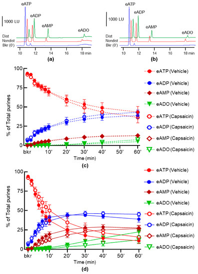Effect of capsaicin on the hydrolysis of eATP by s-ENTDs released in cELS of detrusor-free bladder preparations. Original chromatograms of eATP in beaker (Bkr, blue, 0′, no enzyme present) and at 60 min of enzymatic reaction in cELS of nondistended (Nondist, red) and distended (Dist, green) bladder preparations treated with vehicle (a) or capsaicin (b). LU, luminescence units. Note the decrease of eATP substrate and the increase or appearance of the 1,N6-etheno-products (e-products) 1,N6-etheno-ADP (eADP), 1,N6-etheno-AMP (eAMP) and 1,N6-etheno-ADO (eADO). Summarized data showing time-courses of eATP hydrolysis in cELS in the presence of vehicle (DMSO 0.1%, n = 7) or capsaicin 1 µM (n = 5) in nondistended (c) and distended (d) bladders; n, number of bladder preparations. eATP, eADP, eAMP and eADO are presented as percentages of total purines (eATP + eADP + eAMP + eADO) present in reaction solutions. p > 0.05, vehicle control vs. capsaicin, two-way ANOVA with Sidak’s multiple comparisons tests.