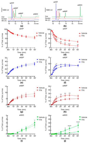 Effects of TTX on the hydrolysis of eATP by s-ENTDs released in cELS of nondistended and distended detrusor-free bladder preparations. Original chromatograms of eATP in beaker (Bkr, blue, 0′, no enzyme present) and at 60 min of enzymatic reaction in cELS of nondistended (Nondist, red) and distended (Dist, green) bladder preparations treated with vehicle (a) or TTX (b). LU, luminescence units. Summarized data showing changes in eATP, eADP, eAMP and eADO in the presence of vehicle (Krebs bicarbonate solution, KBS, n = 8) or TTX 0.5 µM (n = 6) in nondistended (c,e,g,i) and distended (d,f,h,j) bladder preparations; n, number of bladder preparations. eATP, eADP, eAMP and eADO are presented as percentages of total purines (eATP + eADP + eAMP + eADO) present in reaction solutions. Asterisks denote significant difference from vehicle controls. * p < 0.05, ** p < 0.01, *** p < 0.001, **** p < 0.0001. Two-way ANOVA with Sidak’s multiple comparisons tests.