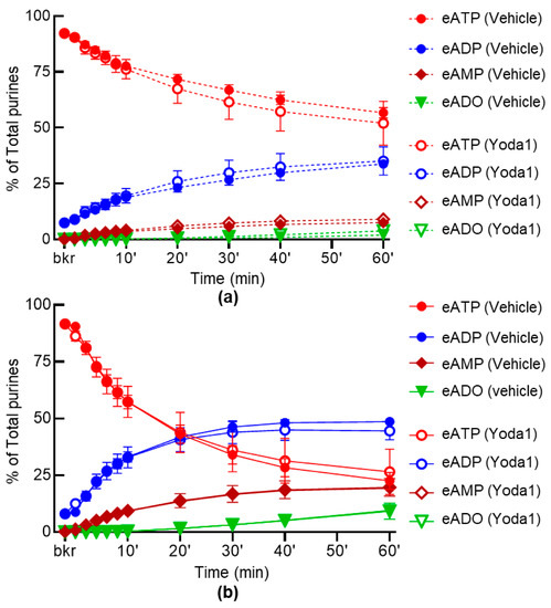 Effect of YODA1 on the hydrolysis of eATP by s-ENTDs released in cELS of detrusor-free bladder preparations. Changes in eATP, eADP, eAMP and eADO in the presence of vehicle (DMSO 0.2%, n = 6) or Yoda1, 40 µM (n = 5) in nondistended (a) and distended (b) bladder preparations; n, number of bladder preparations. eATP, eADP, eAMP and eADO are presented as percentages of total purines (eATP + eADP + eAMP + eADO) present in reaction solutions. p > 0.05 at all time-points of reaction. Two-way ANOVA with Sidak’s multiple comparisons tests.