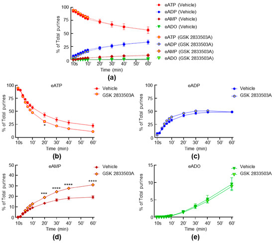 Effects of GSK 2833503A on the hydrolysis of eATP by s-ENTDs released in cELS of detrusor-free bladder preparations. Changes in eATP, eADP, eAMP and eADO in the presence of vehicle (DMSO 0.2%, n = 6) and GSK 2833503A, 1 µM (n = 3) in nondistended (a) and distended (b,c,d,e) bladder preparations; n, number of bladder preparations. eATP, eADP, eAMP and eADO are presented as percentages of total purines (eATP + eADP + eAMP + eADO) present in reaction solutions. Asterisks denote significant difference from vehicle controls. * p < 0.05, *** p < 0.001, **** p < 0.0001. Two-way ANOVA with Sidak’s multiple comparisons tests.