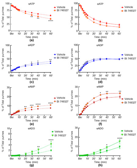 Effects of BI 74932 on the hydrolysis of eATP by s-ENTDs released in cELS of nondistended and distended detrusor-free bladder preparations. Changes in eATP, eADP, eAMP and eADO in the presence of vehicle (DMSO 0.2%, n = 6) and BI 74932, 1 µM (n = 3) in nondistended (a,c,e,g) and distended (b,d,f,h) bladder preparations; n, number of bladder preparations. eATP, eADP, eAMP and eADO are presented as percentages of total purines (eATP + eADP + eAMP + eADO) present in reaction solutions. Asterisks denote significant difference from vehicle controls. * p < 0.05, ** p < 0.01, *** p < 0.001, **** p < 0.0001. Two-way ANOVA with Sidak’s multiple comparisons tests.