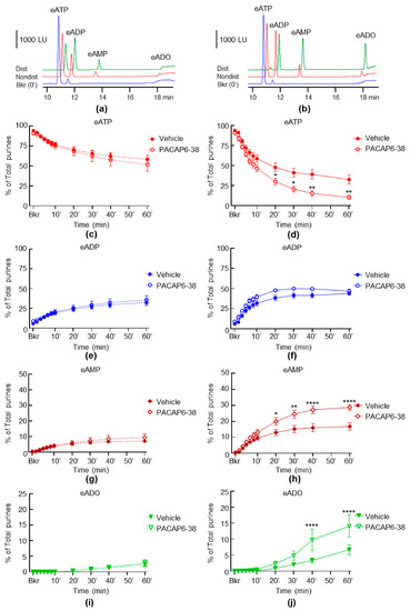 Effects of PACAP6-38 on the hydrolysis of eATP by s-ENTDs released in cELS of nondistended and distended detrusor-free bladder preparations. Original chromatograms of eATP in beaker (Bkr, blue, 0′, no enzyme present) and at 60 min of enzymatic reaction in cELS of nondistended (Nondist, red) and distended (Dist, green) bladder preparations treated with vehicle (a) or PACAP6-38 (b). LU, luminescence units. Summarized data showing changes in eATP, eATP, eADP, eAMP and eADO in the presence of vehicle (KBS, n = 8) and PACAP6-38, 0.3 µM (n = 5) in nondistended (c,e,g,i) and distended (d,f,h,j) bladder preparations; n, number of bladder preparations. eATP, eADP, eAMP and eADO are presented as percentages of total purines (eATP + eADP + eAMP + eADO) present in reaction solutions. Asterisks denote significant difference from vehicle controls. * p < 0.05, ** p < 0.01, **** p < 0.0001. Two-way ANOVA with Sidak’s multiple comparisons tests.