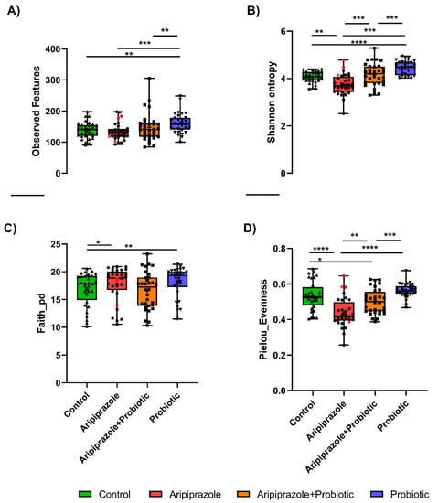 Modulation of microbiota composition following treatment with aripiprazole and probiotics. (A) observed features, (B) Shannon index, (C) Faith’s phylogenetic diversity, and (D) Pielou evenness of all treated samples (n = four biological replicates each). Results were calculated from rarefied 12,000 reads per sample using QIIME2. 2020.6 version. Middle lines represent the mean. Data were analyzed using the Kruskal- Wallis test and Two-stage Benjamini, Krieger, and Yekutieli FDR procedure; * p < 0.05, ** p < 0.01, *** p < 0.001, **** p < 0.0001. Red dots represent the zero time points.