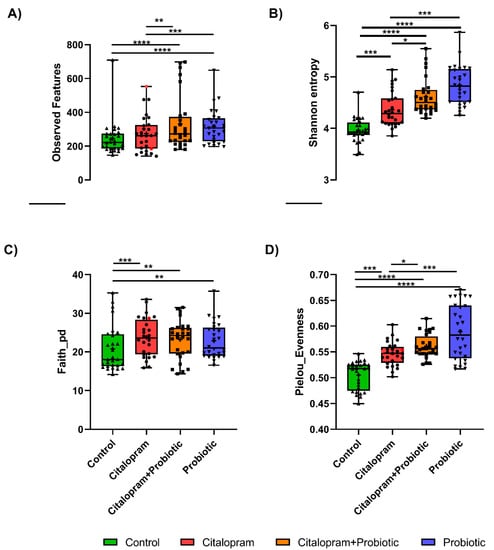 Modulation of microbiota composition following treatment with (S)-citalopram and probiotics. (A) observed features, (B) Shannon index, (C) Faith’s phylogenetic diversity, and (D) Pielou evenness of all treated samples (n = four biological replicates each). Results were calculated from rarefied 12,000 reads per sample using QIIME2. 2020.6 version. Middle lines represent the mean. Data were analyzed using the Kruskal- Wallis test and Two-stage Benjamini, Krieger, and Yekutieli FDR procedure; * p < 0.05, ** p < 0.01, *** p < 0.001, **** p < 0.0001. Red dots represent the zero time points.
