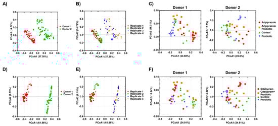 Plots of Principal Coordinate Analysis (PCoA) based on Bray-Curtis distances among the identified microbiota in different samples. (A–C): effect of aripiprazole treatment; (D–F) effect of (S)-citalopram treatment. The PCoA figures show clustering based on source donor (A,D); experiment replicate (B,E) and treatments of each donor microbiota (C,F). The samples were colored as indicated in legends. PCoA1 and PCoA2 represent the top two coordinates that captured the highest microbial variability among samples, and the percentage shown indicates the fraction of variation represented by each coordinate.