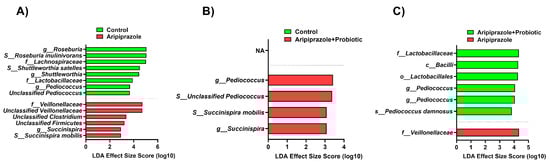 Histograms of the linear discriminant analysis (LDA) scores showing microbial taxa that vary significantly in abundance between: (A) no-treatment control and aripiprazole treatment, (B) no-treatment control and aripiprazole + probiotic treatment, and (C) aripiprazole and aripiprazole + probiotic treatments.