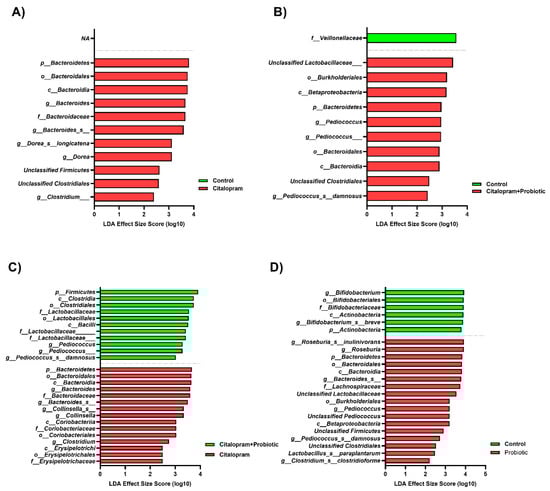 Histograms of the linear discriminant analysis (LDA) scores showing microbial taxa that vary significantly in abundance between: (A) no-treatment control and (S)-citalopram treatment, (B) no-treatment control and (S)-citalopram + probiotic treatment, (C) (S)-citalopram and (S)-citalopram + probiotic treatments, (D) no-treatment control and probiotic treatment.