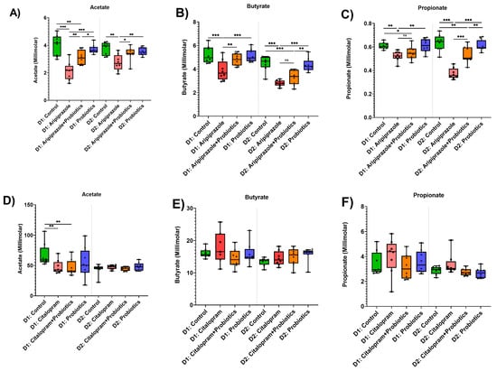Short-chain fatty acids (SCFAs) concentration was measured by GC over 48 h with all treatment groups with aripiprazole (A–C) or Citalopram (D–F). (A,D) acetate, (B,E) butyrate, and (C,F) propionate. Each time point is represented with 4 biological replicates × 2 technical measures. Different treatments are compared statistically for each donor using one way ANOVA test followed by correction for multiple comparisons by controlling false discovery rate using the two-stage step up procedure of Benjamini Krieger and Yekutieli. * p < 0.05, ** p < 0.01, *** p < 0.001.