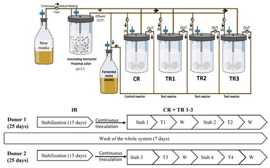 Experimental reactor set-up of the ex vivo fermentation model. IR: inoculum reactor, containing immobilized donor feces (30% v/v); CR: control reactor; TR1-TR3: test reactors 1–3; Stab: stabilization period (2 days); T: treatment period (2 days); W: wash period (1 day).