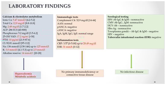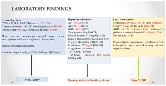We illustrate the case of a 10-year-old boy who presented for weight loss (4 kg in 12 months), fatigue, and feeling sick with an insidious onset in the last year. His past medical history includes multiple respiratory infections during early childhood and nonspecific enterocolitis one year before the current presentation. On this latter occasion, hypercalcemia, as well as elevated serum urea and creatinine levels, were detected but were considered secondary to dehydration, although they did not improve with adequate hydration. Hepatic cytolysis was also constantly present in the last year. Clinical examination revealed massive hepatosplenomegaly, pallor, and oliguria, while biologically, elevated serum creatinine was noted, corresponding to an eGFR of 25 mL/min/1.73 m2 (Schwartz’s pediatric equation). He required admission to our pediatric nephrology department. He was hemodynamically stable, conscious, febrile, and in general distress. A follow-up evaluation revealed pancytopenia with a normal bone marrow assessment and no immunophenotyping abnormalities. Therefore, we concluded that the pancytopenia was in the liver damage. A negative carcinoembryonic antigen ruled out neoplastic disease. Moderate hepatic cytolysis and cholestasis were observed, with normal coagulation parameters. Hypercalcemia, low plasma parathyroid hormone levels, and metabolic acidosis were present, while urinalysis revealed hematuria, proteinuria, leukocyturia without hypercalciuria, and a negative urine culture. All of the differential diagnoses made upon admission to our department are summarized in Figure 1 and Figure 2.