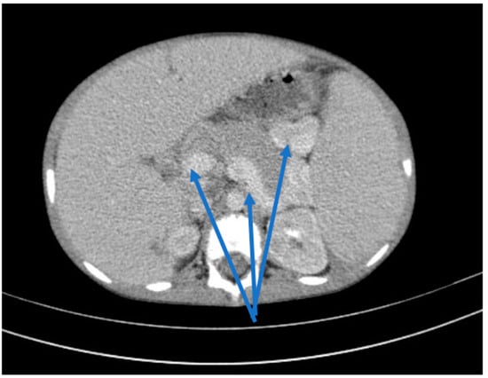 Renal function deteriorated rapidly to a creatinine clearance of 10 mL/min/1.73 m2, requiring the initiation of hemodialysis on day 5 after admission. A history of drug ingestion that could cause acute interstitial nephritis was negative. Serologic tests for Epstein–Barr virus, cytomegalovirus, hepatitis C/B, human immunodeficiency virus, Toxoplasma gondii, and tuberculin skin reaction were negative. In the absence of specific immunological findings, a marked inflammatory syndrome or antibodies such as p-ANCA, c-ANCA or antinuclear antibodies, primary immunodeficiency, a connective tissue disease or vasculitis were excluded. Renal ultrasound evaluation was highly suggestive of nephrocalcinosis. After this preliminary evaluation, the diagnosis of advanced renal disease was made; therefore, the patient started chronic hemodialysis. Thoracic–abdominal computed tomography confirmed renal medullary calcifications, hepatosplenomegaly, hyperdense splenorenal and splenogastric masses as indicators of portal hypertension (Figure 3 and Figure 4).