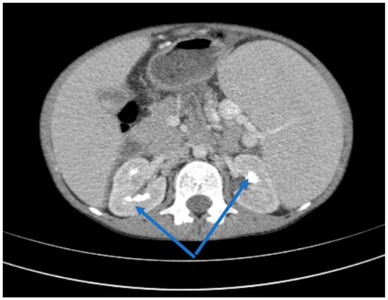 Axial CT scans, bilateral medullary nephrocalcinosis (blue arrow).