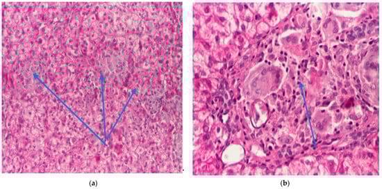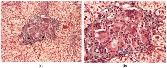 (a): PAS coloration ×100; (b): PAS coloration ×200. Liver tissue showing chronic giant cell granulomatous hepatitis (blue arrows) (personal collection, St. Mary Emergency Children’s Hospital, Iasi).