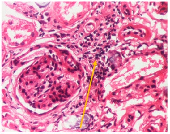 Hematoxylin-eosin staining ×200; renal tissue showing interstitial inflammation (yellow arrow) (personal collection, St. Mary Emergency Children’s Hospital, Iasi).