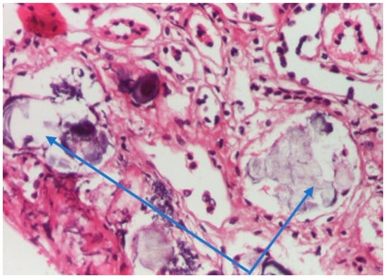Hematoxylin-eosin staining ×200; renal tissue showing calcifications (blue arrows) (personal collection, St. Mary Emergency Children’s Hospital, Iasi).