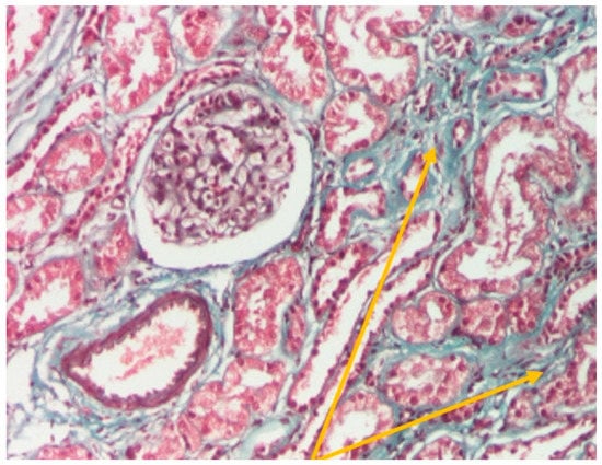 Szekely trichrome staining ×100; renal tissue showing interstitial fibrosis (yellow arrow) (personal collection, St. Mary Emergency Children’s Hospital, Iasi).