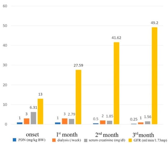 Coutant et al., retrospectively analyzed 11 children with renal granulomatous sarcoidosis confirmed by renal histology after a mean follow-up of 5.5 years; 3 patients developed end-stage renal failure, and 1 had chronic insufficiency after interruption of medical supervision and prednisone therapy []. The evolution to CKD stage 5 was noticed in patients exclusively diagnosed with GIN, while that with CKD 1–2 predominantly had non-granulomatous tubulointerstitial nephritis (ngTIN); all of these findings are supported by data from an adult case series []. Patients who have interstitial nephritis may also have nephrolithiasis or nephrocalcinosis []. Our patient was evaluated as having improved kidney function after treatment, with his renal histology being nephrocalcinosis, nephrolithiasis, and non-granulomatous nephritis. After multiple debates, the question that nephrocalcinosis and/or GIN might have a better prognosis remains uncertain. In Table S1, we have summarized all the studies of sarcoidosis with renal involvement in children that were the basis of this review [,,,,,,,,,,,,,].